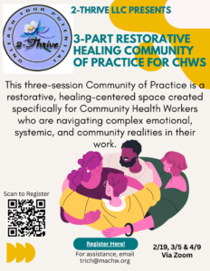 This three-session Community of Practice is a restorative, healing-centered space created specifically for Community Health Workers who are navigating complex emotional, systemic, and community realities in their work. Grounded in restorative practices, trauma-informed care, and anti-oppressive frameworks, this series invites CHWs to slow down, reflect, and collectively process the impacts of burnout, secondary trauma, and ongoing systemic pressures.Across three one-hour sessions, participants will engage in grounding practices, guided reflection, and collective dialogue that honors lived experience, cultural wisdom, and the realities of serving communities they are often deeply connected to (including immigrant and refugee communities impacted by harmful policies and structural inequities). The series is designed to support sustainability, resilience, and collective healing while strengthening connection to self, community, and purpose.